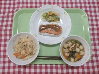 里芋ごはん あんかけ汁 魚のみそマヨドレ焼 野菜の甘酢あえ