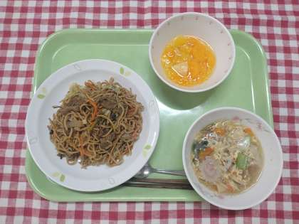 ソース焼きそば 卵入りワンタンスープ フルーツポンチ 牛乳