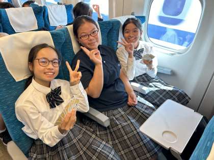 わくわくの修学旅行。新幹線ではトランプなどをして楽しく過ごしています。