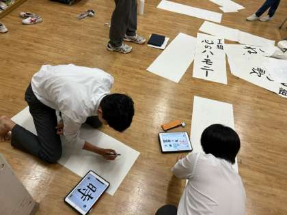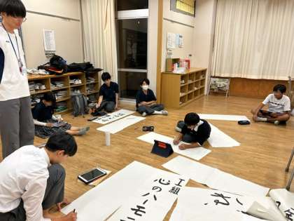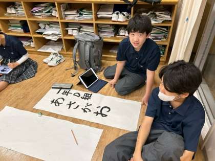 めくりプロ作成のために、学発実行委員が放課後教室に集まっています。めくりプロとは、合唱コンクール舞台脇で紙のプログラムをめくってお知らせする演出小道具です。手作りの良さ、文字にも風情があってとてもいいものですね。当日、晴れのステージを飾るこれらの小物たちにも是非注目してみてください!