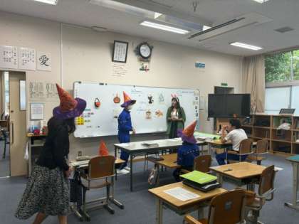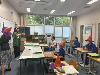 少し早いですが、I組では英語の授業でハロウィンパーティーをしました。ハロウィンの帽子をかぶって、みんな楽しそうです!