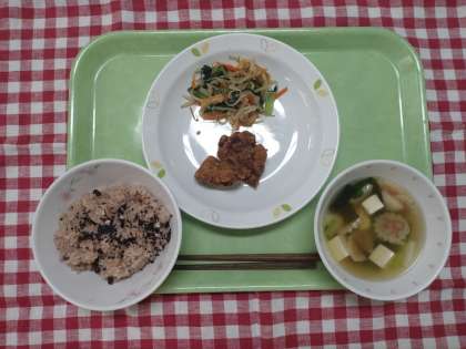 赤飯 鶏肉のから揚げ カリカリ油揚げと野菜のお浸し 祝い汁 牛乳