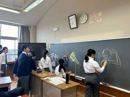 朝からクラス有志が集まり「黒板アート」が始まりました。合唱コンクールに向けてどのクラスも気合いが入っています。本番の発表がとても楽しみです。