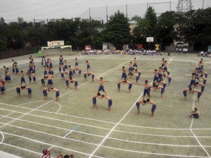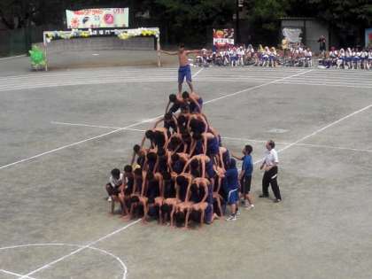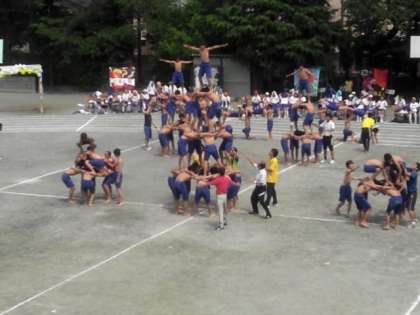 24年度体育祭、午後の始めは男子組体操です。レインボーブリッジ、お山ピラミッド、四段タワーなど、難易度の高い演技を次々とこなし、素晴らしい組体操を披露できました。