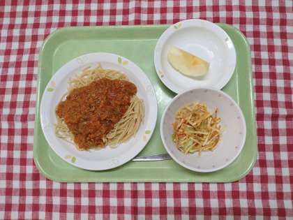 ミートスパゲッティー フライドポテトサラダ くだもの(りんご) 牛乳