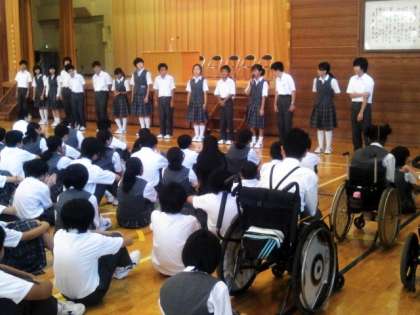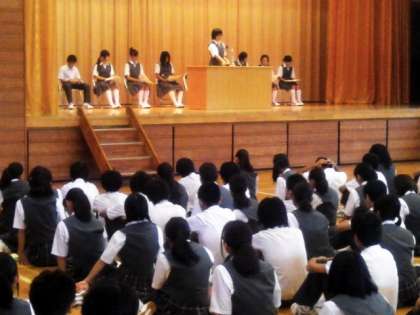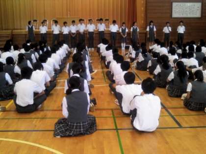 あいさつ運動の後、体育館にて生徒会朝礼が行われました。始めに前期専門委員会から活動報告、次に選挙管理委員会の紹介、最後に後期生徒会本部役員と専門委員長の立候補者が紹介されました。