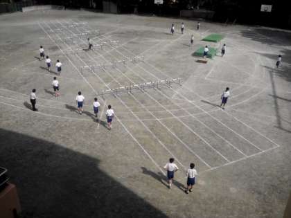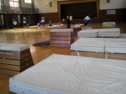 研究授業の体育・食育部会は、男子は陸上、女子は器械体操に取り組みました。