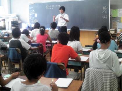 10月6日(土)、「みしまの森学舎」の各小学校に、本校の教員が赴いての出張授業を実施しました。当日は学校公開日で、多くの保護者がいらっしゃるなか、数学科、理科、英語科の教員が授業をし、中学校の授業を紹介しました。