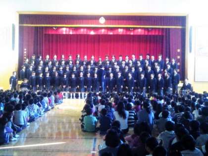 学芸発表会を終えた翌金曜日、11月2日の朝、一年生全員による合唱を東深沢小学校にて披露しました。この日は朝早くから集まり、声出しや合わせの確認をし、小学校の体育館に向かいました。「大切なもの」「マイバラード」の二曲を歌い、懐かしい小学校の児童の皆さん聞いてもらいました。