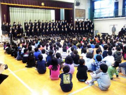 先週金曜日に引き続き、6日(月)の朝、一年生は等々力小学校にて二曲の合唱を披露しました。朝の練習よりも少し緊張したようですが、きれいな歌声を届けることができました。