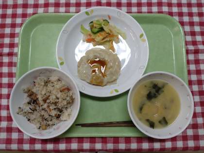 ひじきごはん 豆腐入りサクサクつくね 即席漬け みそ汁 牛乳