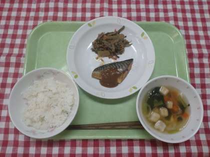 麦ごはん さばのみそ煮 茎わかめのきんぴら すまし汁