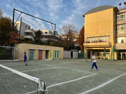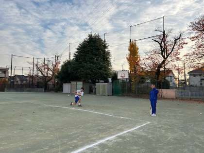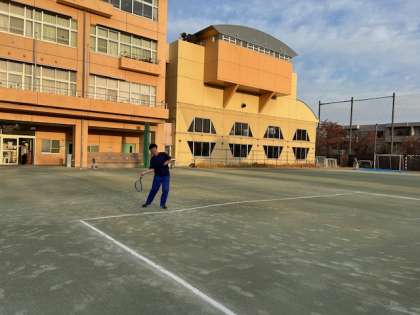 ソフトテニス部の朝練習、活発なラリーがコートに繰り広げられています。男子も女子も、みんなどんどん上達しているようです。