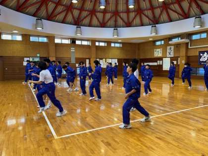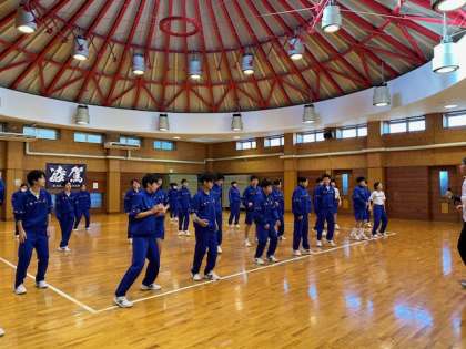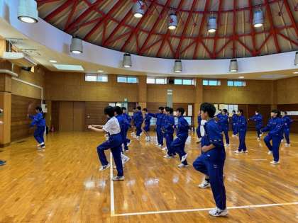 1Bダンスレッスン、ダンス部のお手本を見ながら、みんなで「ランニングマン」のステップに挑戦。立ち位置を変えずに走っているような動き、できるようになると、とっても楽しそうです!