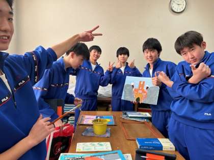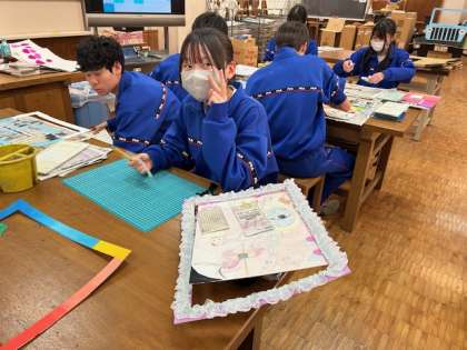 美術の時間、シュールレアリズムをテーマに作品作りをしているのは3年生、額縁まで手作りの力作が完成しつつありました。みんなの想像力の豊かさが作品から溢れ出てくるようで、見ているこちら側もワクワクしてきます。