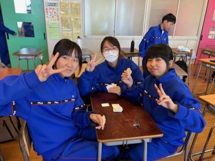 お昼休み、Unoをとうとう手作りし、楽しそうにピース!、大好きな担任の先生とのトークでピース!、可愛い一年生女子たち、みんな笑顔が素敵ですね!
