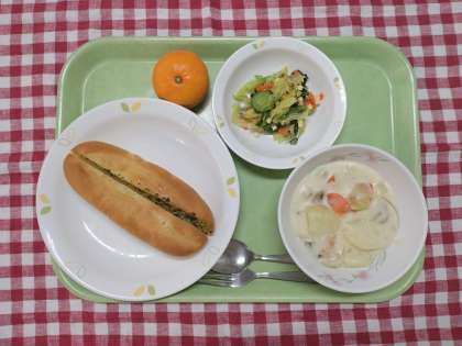 ガーリックトースト クリームシチュー 野菜のイタリアンドレッシングがけ くだもの(みかん) 牛乳
