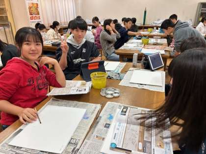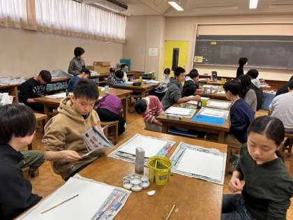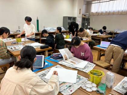鳥獣戯画の作品から登場人物を選び、墨で模写をする、という2年生の美術の授業、面白そうですね。まずは資料集を眺めて、キャラクターを選んでいます。繊細な墨のタッチを楽しく学ぶことができそうです。