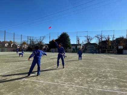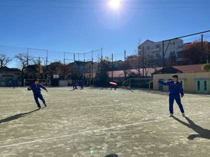 3年生の男子体育、アルティメットで盛り上がっています。「マジ楽しい!」という感想も聞こえてきます。”ultimate”の由来は、ディスクを操るための技術、跳躍力、走力、持久力など、さまざまな能力が必要とされるから、だそうです。ディスク一枚で究極に楽しめるゲームですね!