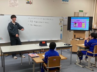 I組ではネットトラブルを避けて、安全に利用するための授業が行われていました。