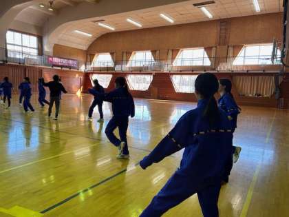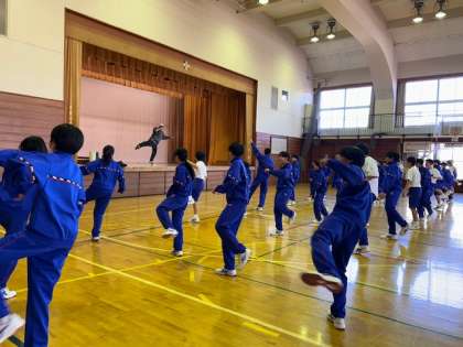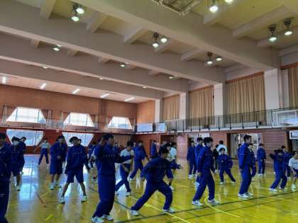 一年生ダンス、ターンをしたり、ポーズをとったり、リズムの中でさまざまな動きを楽しく学んでいます。音楽のパワーで、身体が自然と動いていきます。