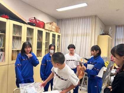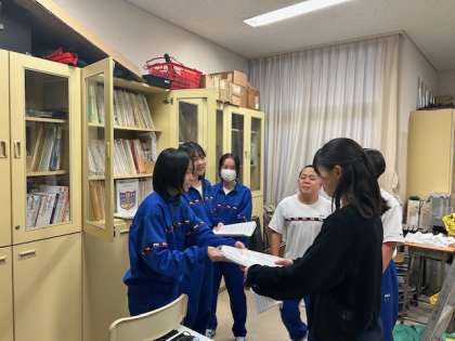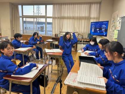 吹奏楽部、譜面を見ながら話し合いをしています。楽器に触れることも大切ですが、譜面を見て曲想をイメージしたり、お互いの意見を伝え合うことも良い演奏には欠かせません。真剣な表情を見ていると、次はどんな曲を演奏してくれるのか、とても楽しみになります。
