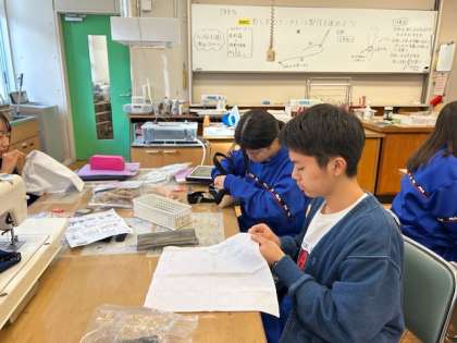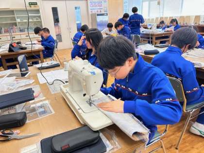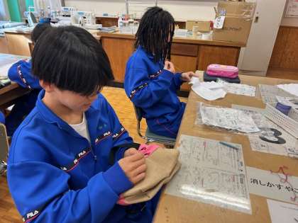 2年生の家庭科は、刺し子の布巾作りや、ミニトートバッグ作成などをしていました。ミニトートのワンポイント刺繍にガンダムキャラクターや、スマイルくんをデザインしている男子たちもいます。みんな楽しんで作業をしているようでした。