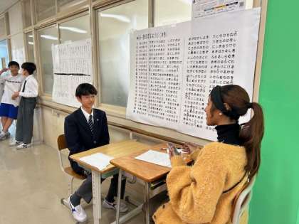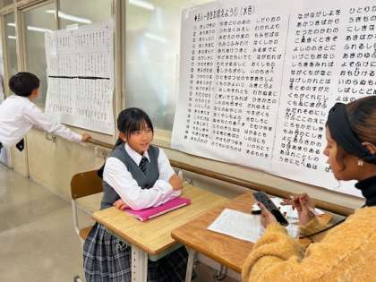 一年生、今日は英語の一問一答、インタビューテストの日でした。時間制限のある中で、たくさん英語で答えることが目標です。「サマンサと、ゆっくりマンツーマンで話したいなあ」と、休み時間に話していた一年生女子たち、サマンサ先生は大人気です。