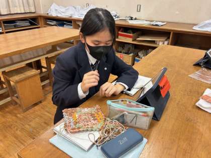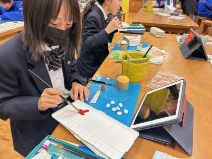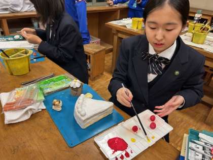 美術部は、3月の学芸発表会の展示に向けて、作品作りに取り組んでいます。大きなストロベリーショート、美味しそうに膨らんだマフィンケーキのオブジェの脇に、手織りのナプキンまで添えて、ティーパーティの楽しい場面を演出するそうです。その他アイデア溢れる楽しい作品をどしどし製作中の美術部、3月が楽しみです。