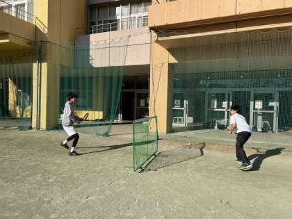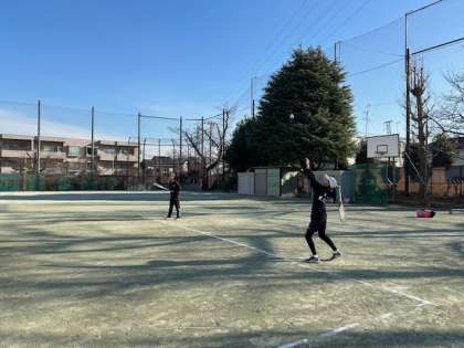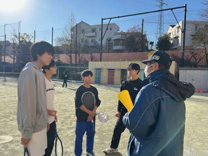 晴れ上がった冬の空、半袖姿で元気にラケットを握っているソフトテニス部一年生、「とてもセンスがあるし、なかなかいいですよ!」とコーチがお話しています。2年生エースコンビとも拮抗した良い試合をしていました。レギュラー選びが悩ましいほどです。みんな切磋琢磨しています。