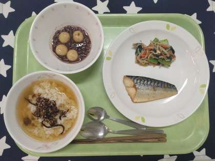 有機米梅茶漬け さばの一味焼き のりあえ 白玉ぜんざい 牛乳