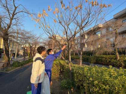 東の空は朝焼けに染まって鮮やか、新しくアスファルト舗装された呑川緑道は、桜色の大きな花びらプリント、枝にそよぐ細長い枯葉の内側に、一列に並ぶ小さな豆が幾何学模様のよう、そんなささやかな発見を肌で感じながら、本日も朝の清掃ボランティア、みんなで頑張りました。