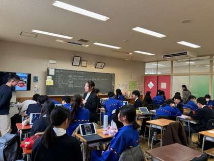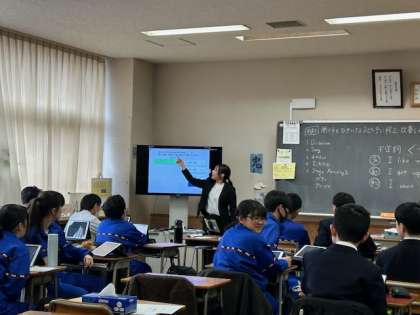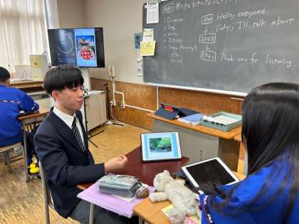 2年生の英語では、SNS投稿風で使った自分の街のお気に入りの場所紹介を、スピーチで発表します。今日は本番前で、ペアやグループ練習をしました。写真を指さしたり、アイコンタクトやジェスチャーを使うことで、聞き手を惹きつける方法を学んでいます。本番も頑張りましょう!