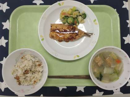 豆ご飯 いわしの蒲焼き 野菜のゆかりかけ 具だくさん汁