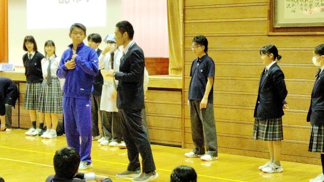 学校生活を支える各委員会の委員長と生徒会メンバーが服装や学校生活に必要なかばんの例を実演してくれました。
