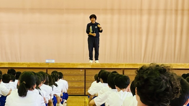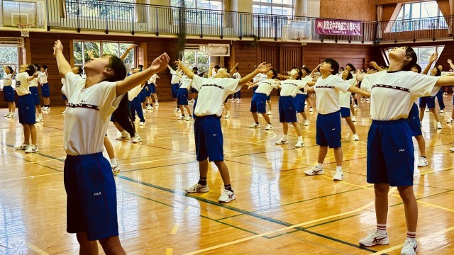 中学校生活で初めての体育祭ということで、ラジオ体操の意味や、ケガなく安全に当日を迎えるために大切なことなどについても話がありました。