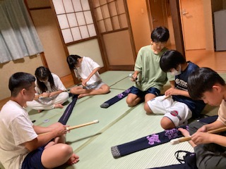 本日のミーティングでは、1日目の稽古の反省と竹刀を分解して、自分で組めるよう練習しました。自分の道具は自分で手入れできるようになろう!!