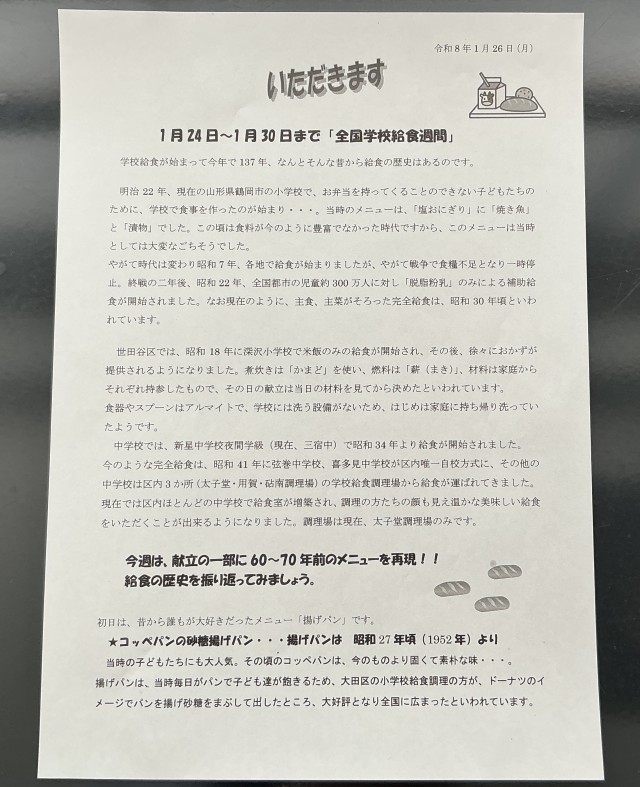 1月24日から30日まで、全国学校給食週間です。なんと学校給食が始まって今年で137年!だそうです。
