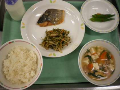 麦ごはん・魚のネギみそ焼き・切干大根の炒め煮・オクラのおかか和え・豆腐汁