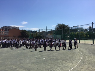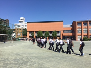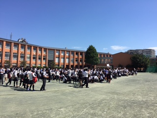 いよいよ2学期がスタートしました。9/1、下校前に地区別の集団下校訓練を実施いたしました。集合→整列→下校の様子です。全校生徒、しっかりやっていました。