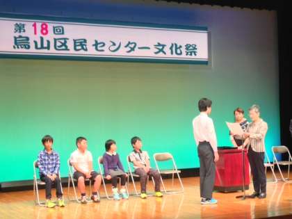10月15日16日の2日間、区民センターで烏山区民センター文化祭が開かれました。本校からは、美術部を中心にポスター8点と絵画16点および保健委員会の研究がポスターで展示されました。第一回より出展してきた本校に対し、堀教育長より感謝状が贈られました。3年生の男子が代表で受け取りました。