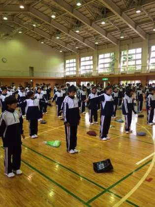 霧雨のため、朝礼は体育館で行いました。