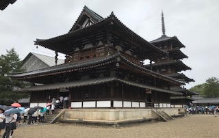 雨の法隆寺。バスガイドさんの話を聞きながら見学。これから宿に向かいます。
