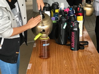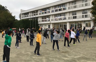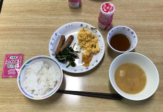 園庭で朝会、ラジオ体操を行い、朝食です。食事係が水筒の準備をします。現在、体調を崩している生徒はいません。