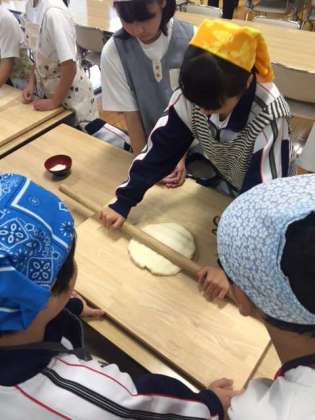 板に粉をふり、のし棒で生地を伸ばしていきます。