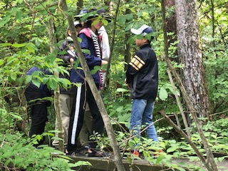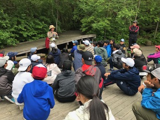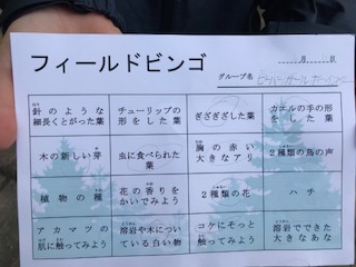 富士山科学研究所の自然の中で、フィールドビンゴを実施。説明もわかりやすく、ビンゴカードのはミッションに各班で挑戦しました。