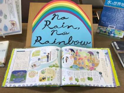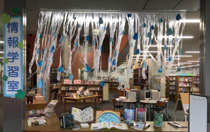 以前、1年生移動教室のための掲示を紹介しましたが、本を読むだけでなく、利用してもらおうと司書さんが掲示の工夫をしています。梅雨に入り季節を感じる掲示物を作っていただきました。