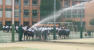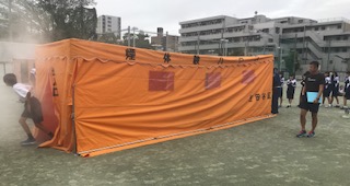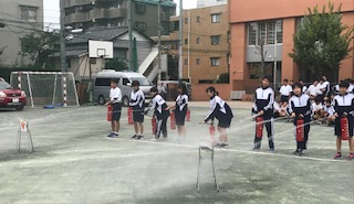 午後、引き取り訓練がありますが、その前に合同防災訓練を行なっています。まずは校庭で煙ハウス体験、D級ポンプ操法訓練、初期消火訓練を行いました。