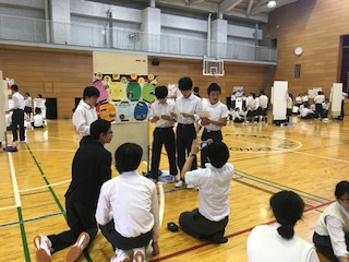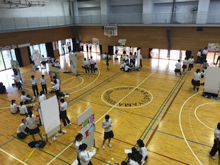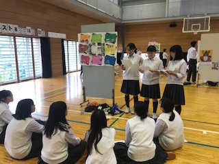 体育館で3年生が屋台村形式でブースを作り、学習してまとめたことを発表しました。初めての試みで慣れないためか各グループとも課題が残ったようです。