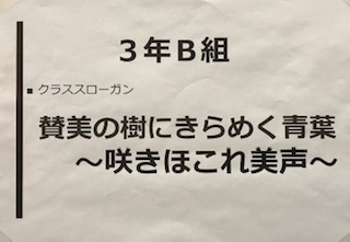 いよいよ3年生のスローガンです。音を届けられませんが、掲示物から生徒の思いを感じていただければと思います。